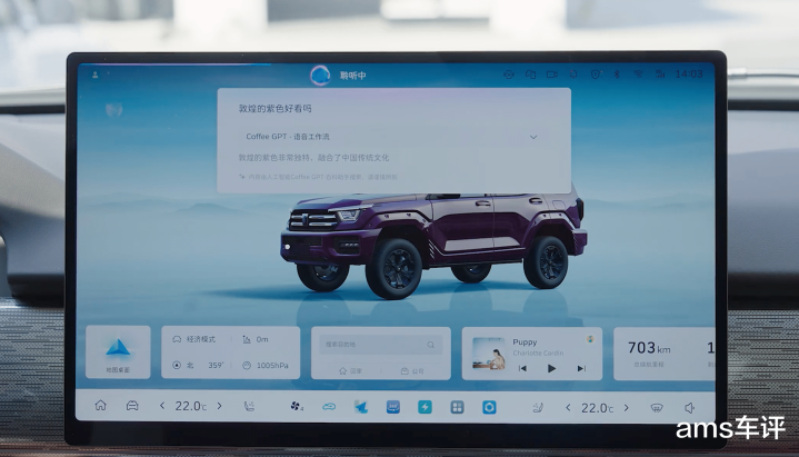 进入车内,坦克400不再是传统意义上的“铁皮越野车”。环抱式中控台配合柔性包覆、镀铬饰条,营造出接近豪华品牌的质感。换装怀挡后,仪表台布局更加规整,视觉上更简洁,也释放出更多储物空间。
