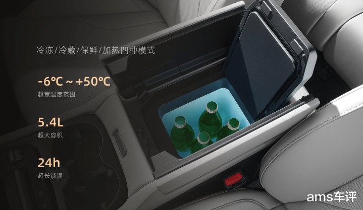 后排还配备了一块15.6英寸娱乐屏,中央扶手箱内则藏着5.4升车载冰箱,旅行途中一瓶冰饮随手可得,舒适与趣味兼顾。